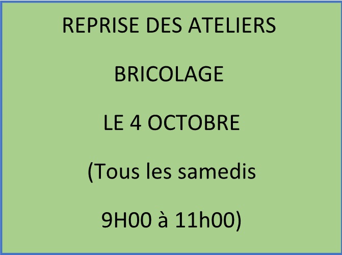 - la reprise des ateliers bricolage à partir du samedi 4 octobre au hangar de 9.00 à 11.30.